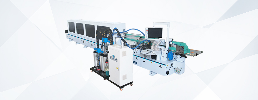 主要功能:分離→預(yù)銑→PUR膠鍋→皮帶壓輪→粗修→精修→刮邊1→刮邊2→齊頭→仿形跟蹤→平刮→清洗→拋光1→拋光2→拋光3